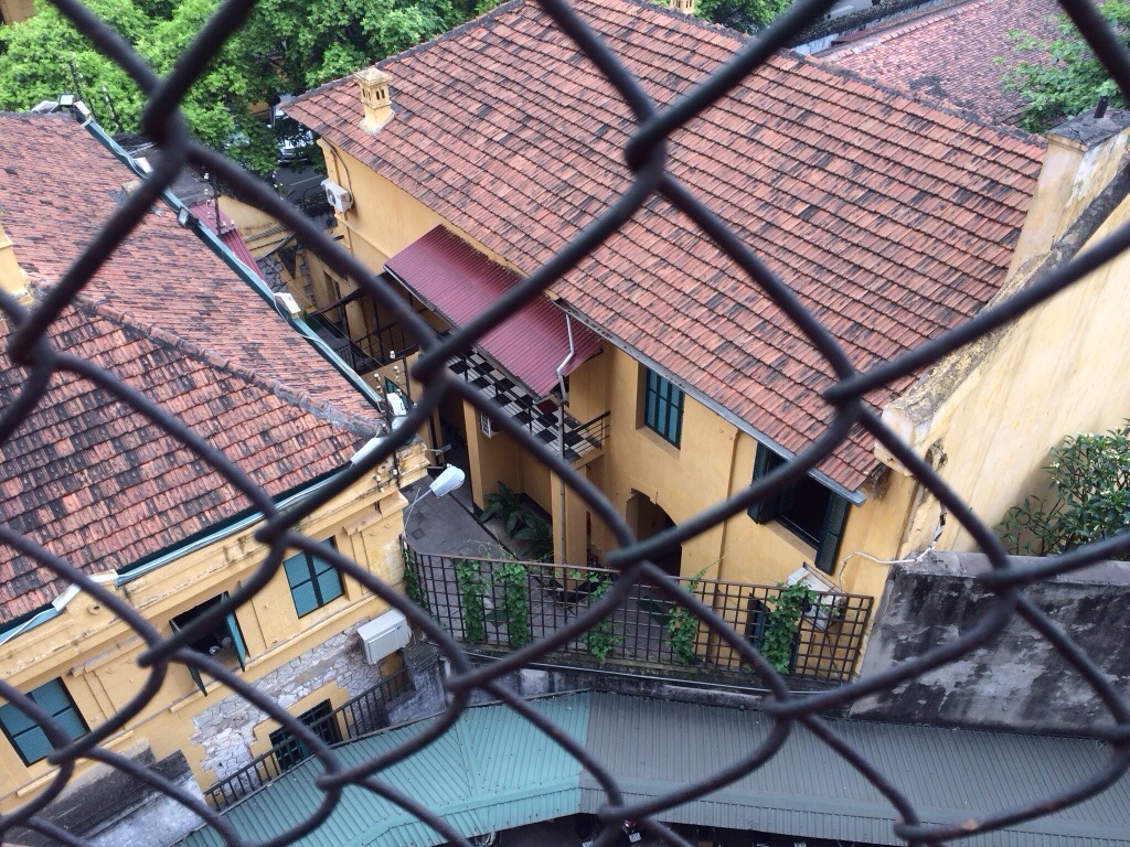Attached are photos taken from the kids play area next to a rooftop tennis court connected to our hotel here in central Hanoi. The yellow building next door is the infamous Hỏa Lò Prison, known by American POWs as the Hanoi Hilton. Notable inmates included James Stockdale, John McCain, and others.