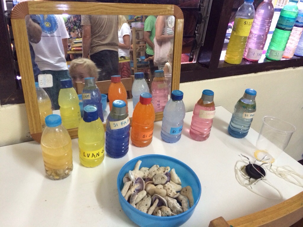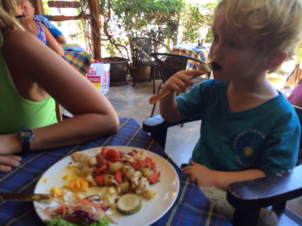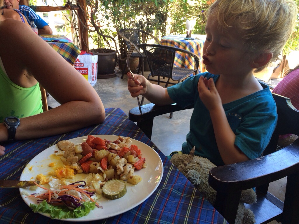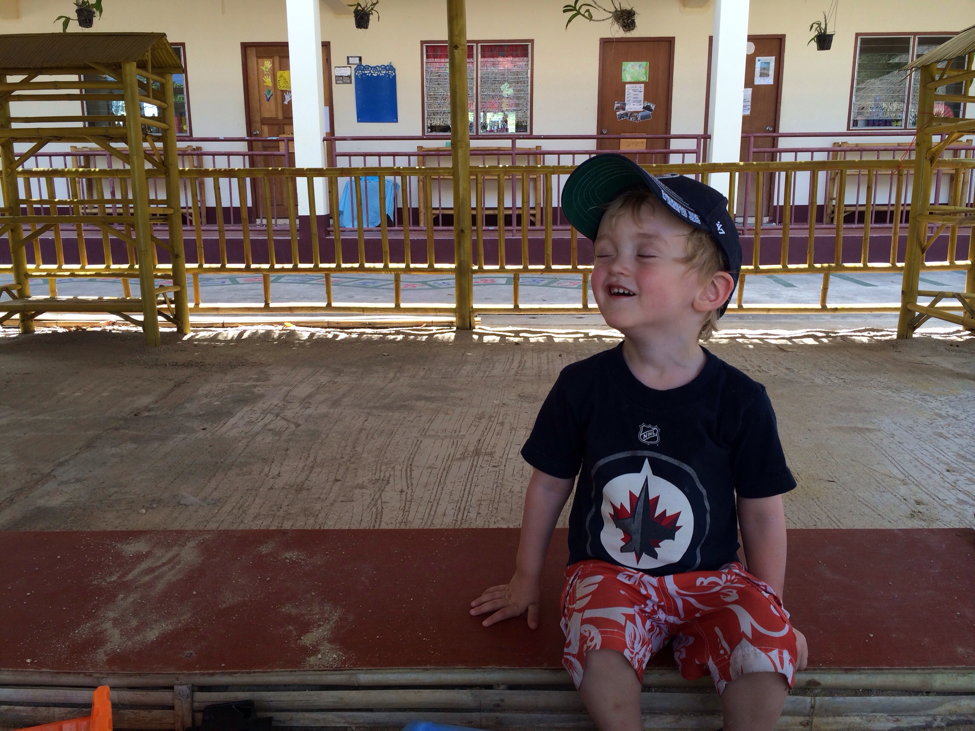 But after just 2 weeks of staying in smaller hotel rooms and one-room bungalows, This 2-room home is a PALACE.  All 3 of us are a bit giddy at having more space.  Max now has his “library” and “toy garage” organized.   We’ve got a gourmet kitchen (fridge big enough to hold yoghurt and fruit, 2 stove elements, a sink that isn’t right next to the toilet).  Clothes can actually be unpacked.